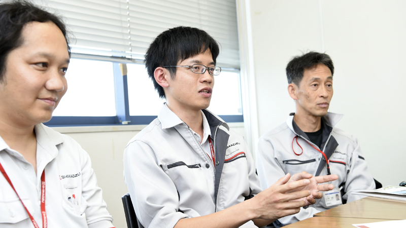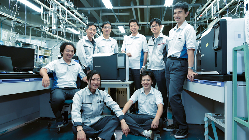 参与GC-2030开发工作的分析测试事业部成员。坐在椅子上的是项目组长、分析测试事业部GC/TA BU GC硬件小组组长寺井靖典(产品左侧),接下来顺时针依次为该事业部技术部固件小组 主任 中野茂畅,技术部 实验室自动化小组 主任 小岛雅弘、主任 冈田昌之,GC/TA BU GC硬件小组 主任 山根雅史、主任 矢野哲、主任 古贺圣规、主任 增田真吾。另外,他们还与设计室反复切磋,对外观精益求精,与工厂认真考虑交期,与品质保证部集思广益。除了成员们的努力外,与其他部门间的良好关系也是达成目标的重要因素。