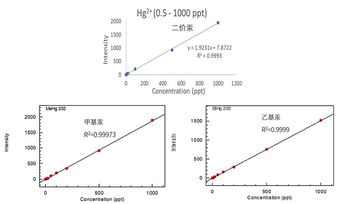 汞的标准品:用超纯水将二价汞、甲基汞和乙基汞标准溶液稀释制成浓度为0.5、1、2、5、20、100、500和1000 ng L-1的溶液。