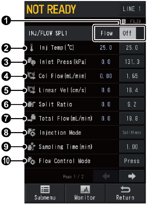 Press HOME button - [Injection Port], and display below screen. Set turn "Flow" on ❶. When using two or more analytical lines, change analytical line.