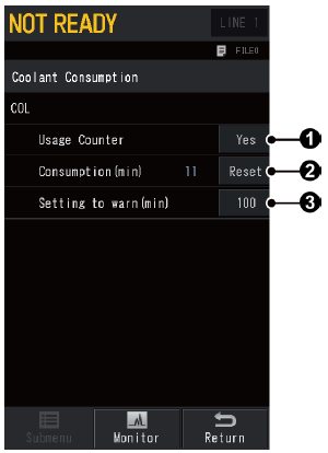 Press HOME button - [Function] - [Diagnosis] - [Coolant Consumption], and then display [Coolant Consumption] screen and reset the consumption (min).