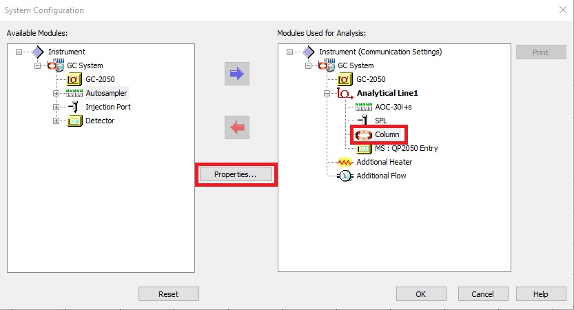 - In the system configuration, double-click [Column] in the modules used for analysis, or select [Column] and click the [Properties] button.