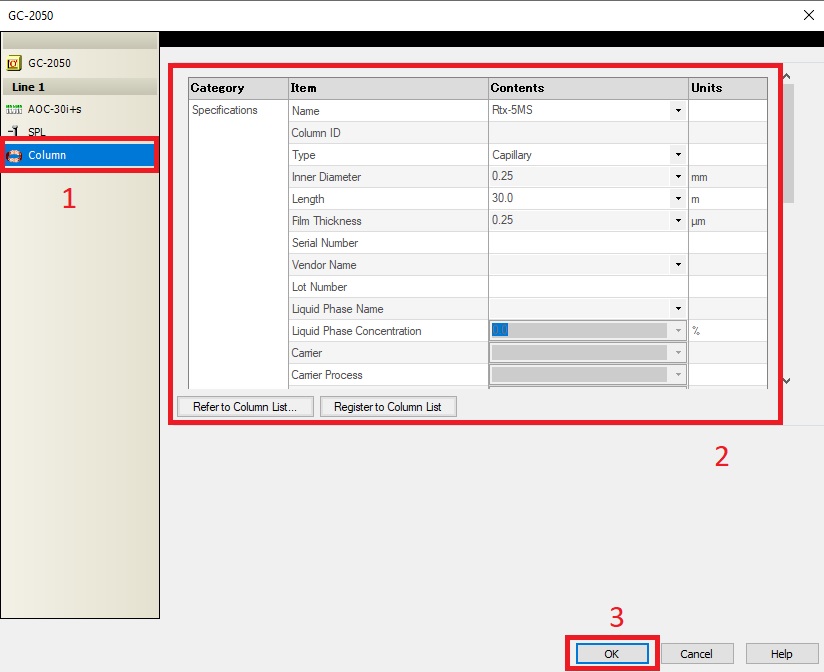 - When using a new column, you need to enter the name, type, inner diameter, and length of the column, as well as the film thickness of the liquid phase and operating temperature range. If necessary, additionally enter the starting date of use of the column, option items, and comment.