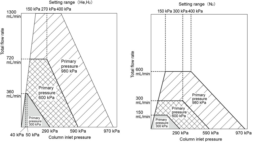 The allowable pressure and flow rate settings are limited by the primary pressure, as shown below. Inaddition, the pressure settings are limited by the column type and the purge flow (it is recommended toset values higher than 1 mL/min and 1 kPa).