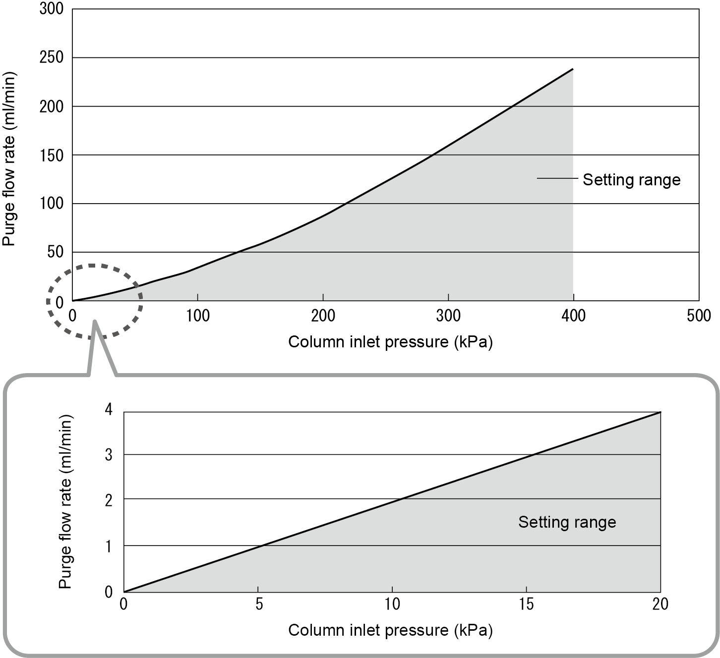 The allowable purge flow setting depends on the column inlet pressure. The following figure shows therange of purge flow permitted.
