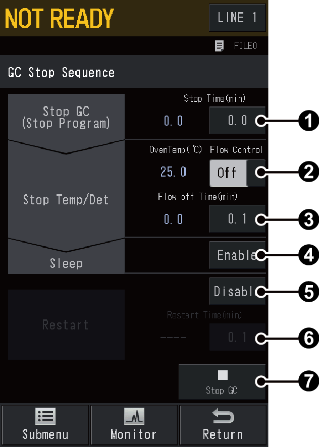 Stop GC | When you press [Stop GC], the GC will stop according to [GC Stop Sequence] screen settings. If you press [Stop GC] while the instrument is performing analysis, GC stop is scheduled and [Abort] is displayed. Press [Abort] to cancel the GC stop. During the GC Shutdown, [GC Start Sequence] is displayed. Press [GC Start Sequence] to display [GC Start Sequence] screen. | ||||||||||||||||