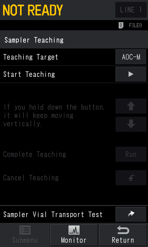Press HOME button - [AOC] - [Sampler Vial Transport Test], and then [Move].