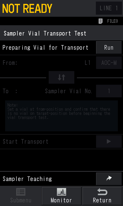 Press HOME button - [AOC] - [Sampler Vial Transport Test], and then [Move].