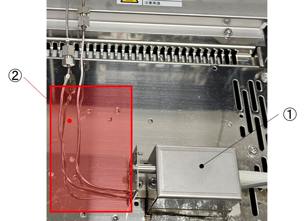 通过确认连接到 ECD检测池的管路数量(2 或 3)来识别气路。 (下图中②所指部分)