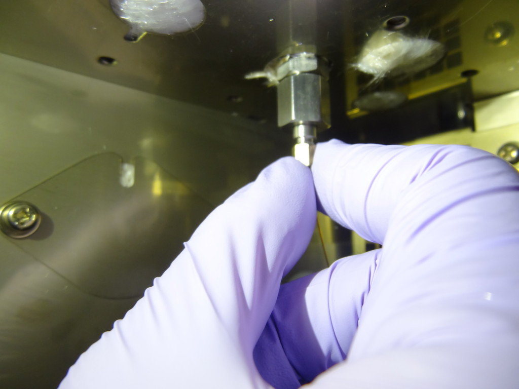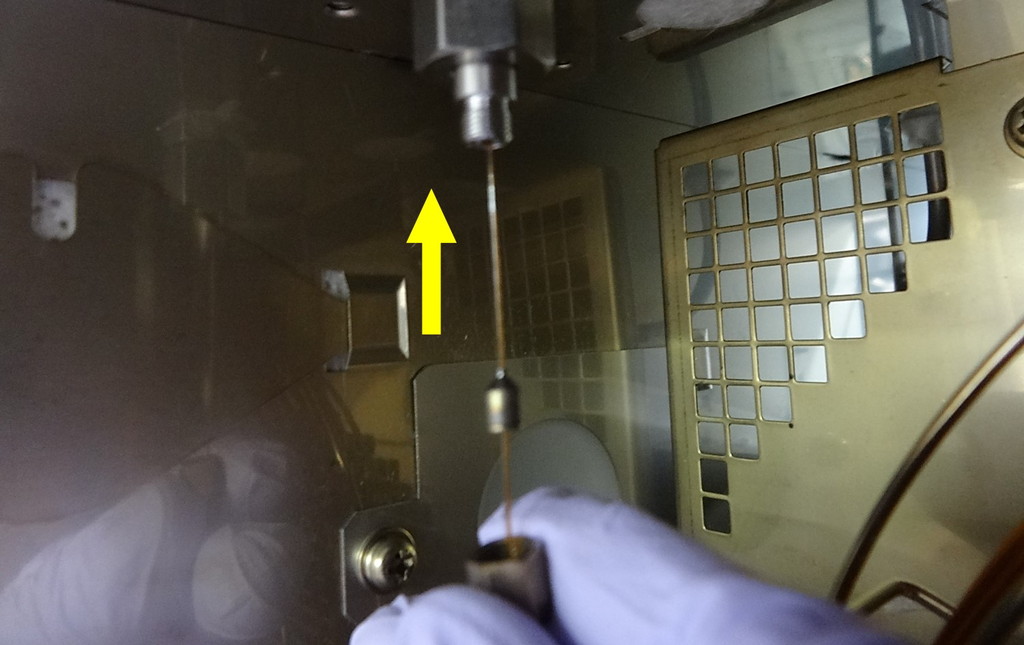 若在未取出定位夹具中石墨的状态下安装色谱柱,取下色谱柱时,石墨可能残留在毛细管柱适配器中,造成堵塞。石墨堵塞时,请拆下毛细管柱适配器,用棉棒去除堵塞。