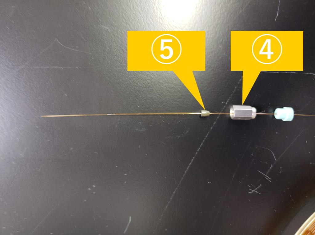 将螺母(不开口)(④)和石墨聚氨酯压环(⑤)穿过色谱柱。
