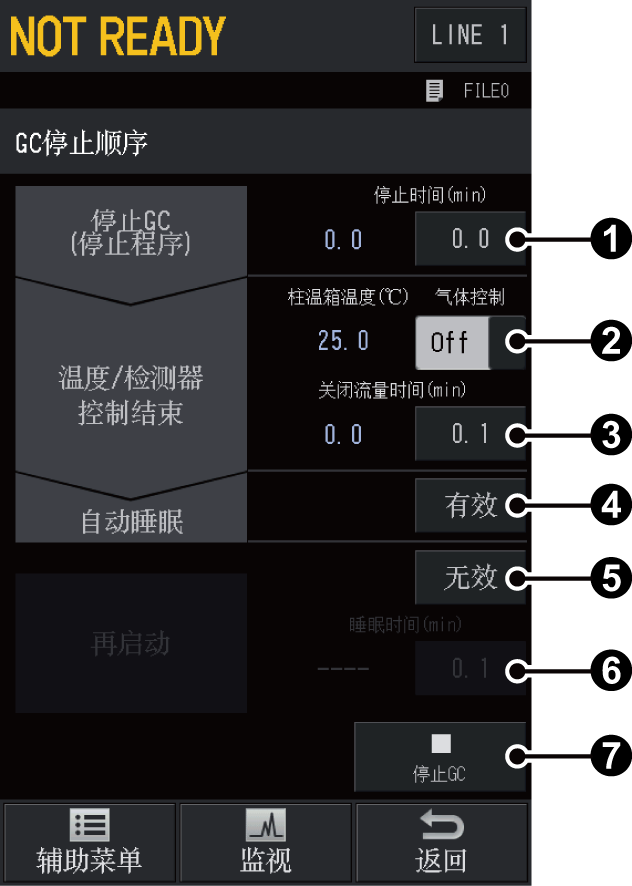 设定从按下 [停止GC]到结束温度/检测器控制所需的时间。