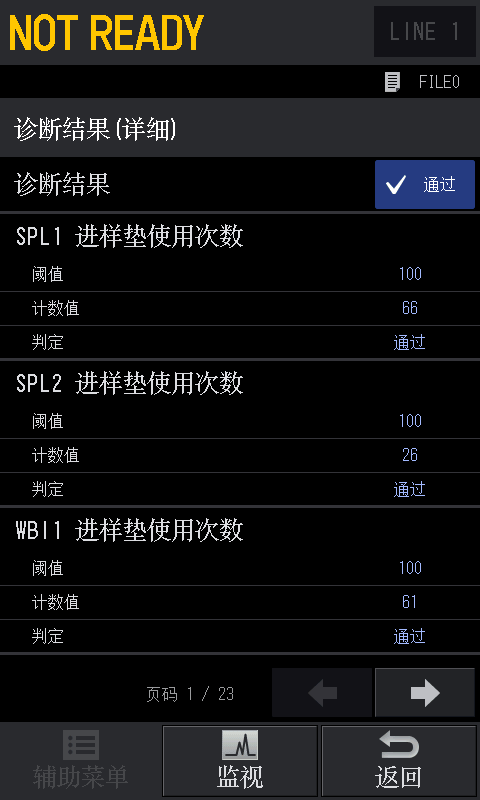 项目 说明 通过 诊断结果在阈值范围内时显示。 失败 诊断结果超出阈值范围时显示。 未检测 中断诊断或设定为不诊断时显示。 不适用 无法对该诊断目标单元进行诊断时显示,如对TCD进行点火测试等。 未选择 因目标未配置到流路中而无法诊断时显示。但有些项目在未配置到流路的状态下也可诊断