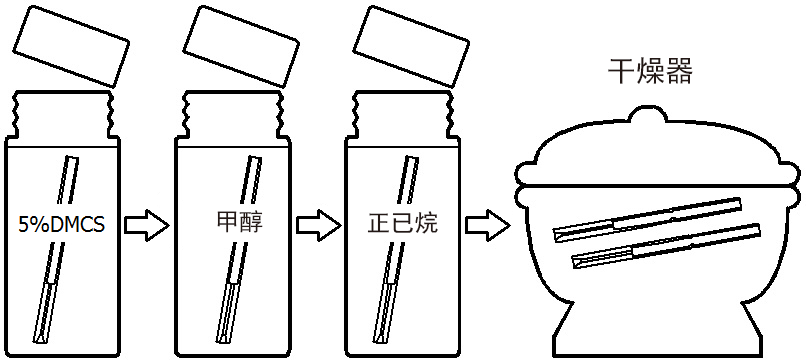 在5 %DMCS或正己烷溶液中浸泡1晚以上,取出玻璃衬管后放到吸水纸上,轻轻擦干处理溶液,然后立即浸入甲醇中(甲氧基化)。