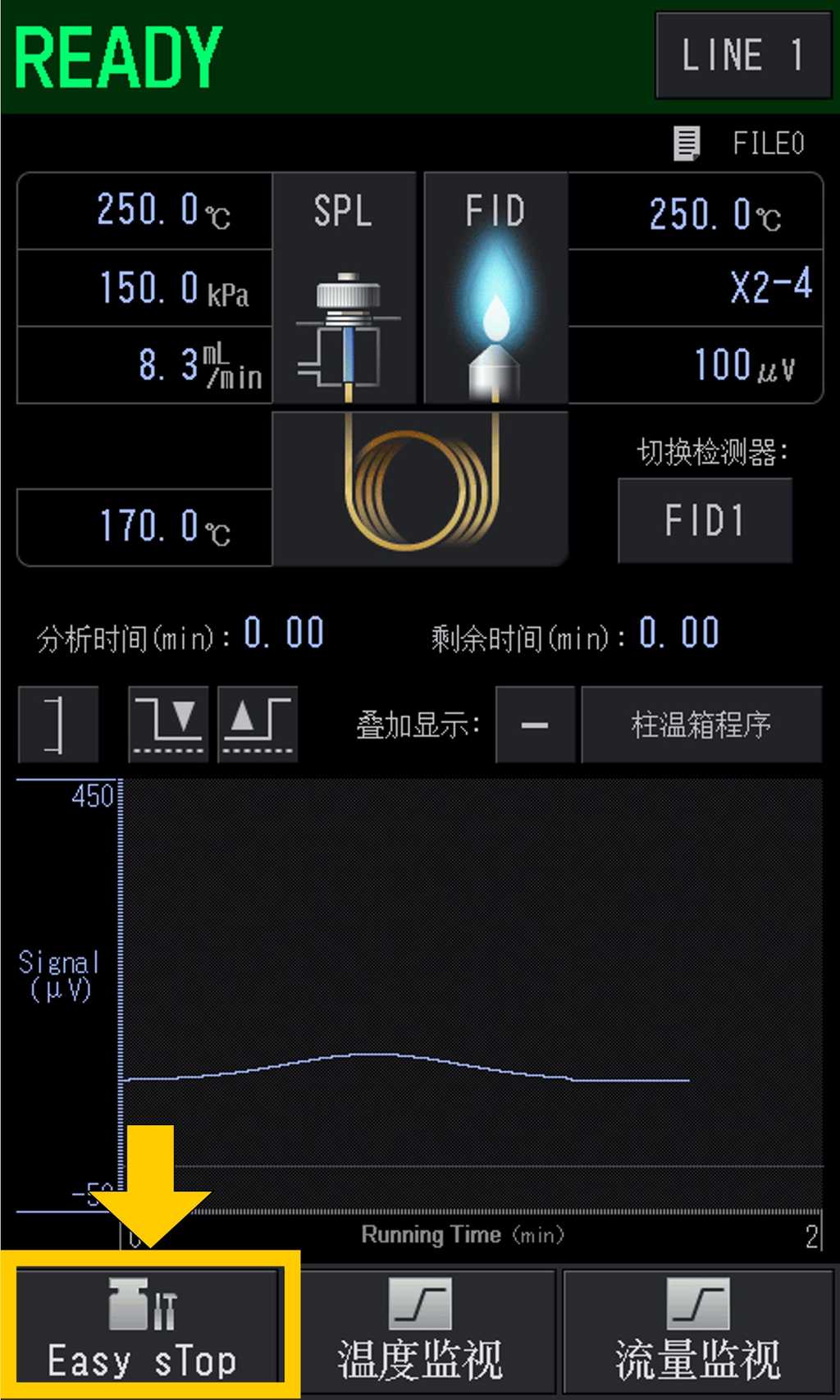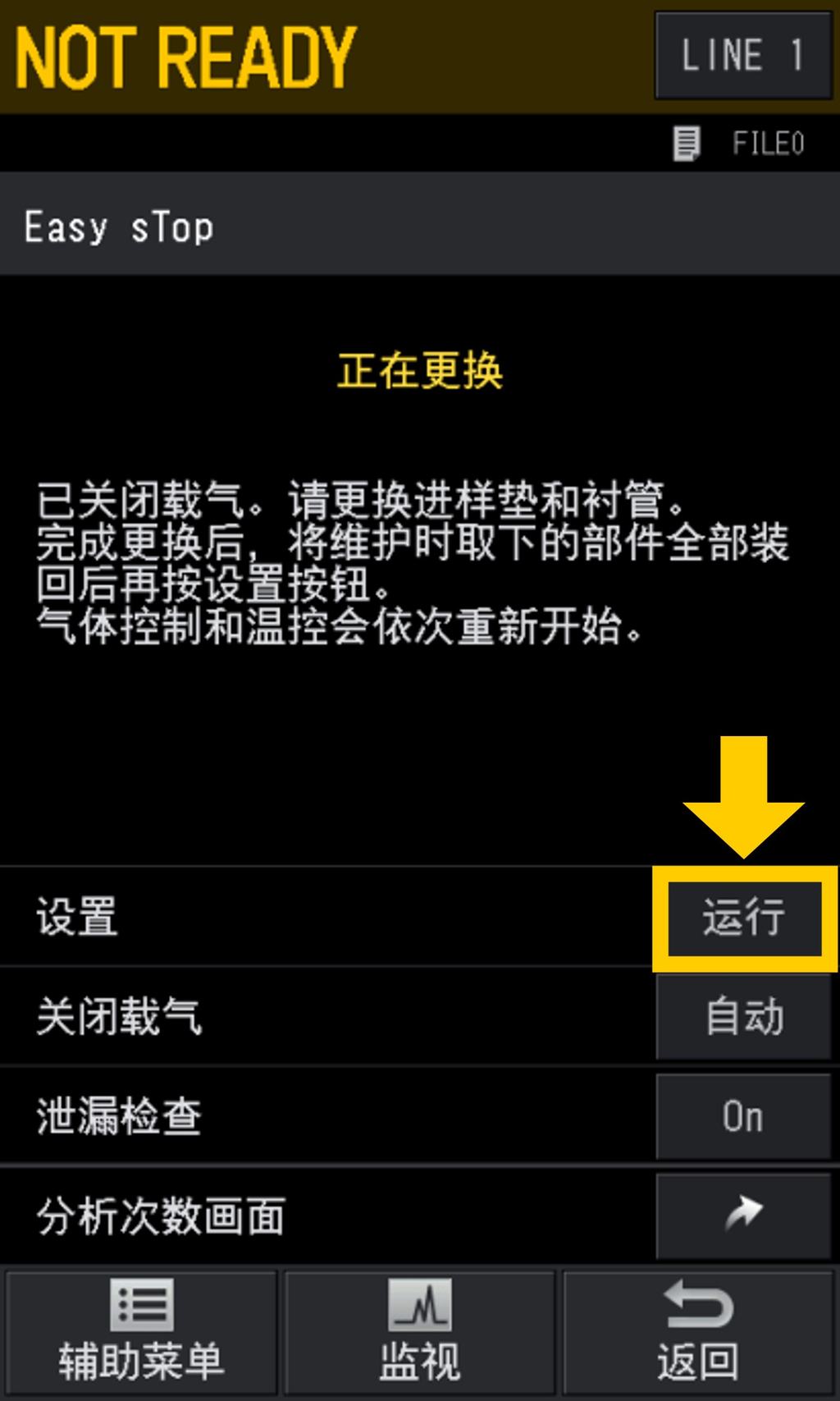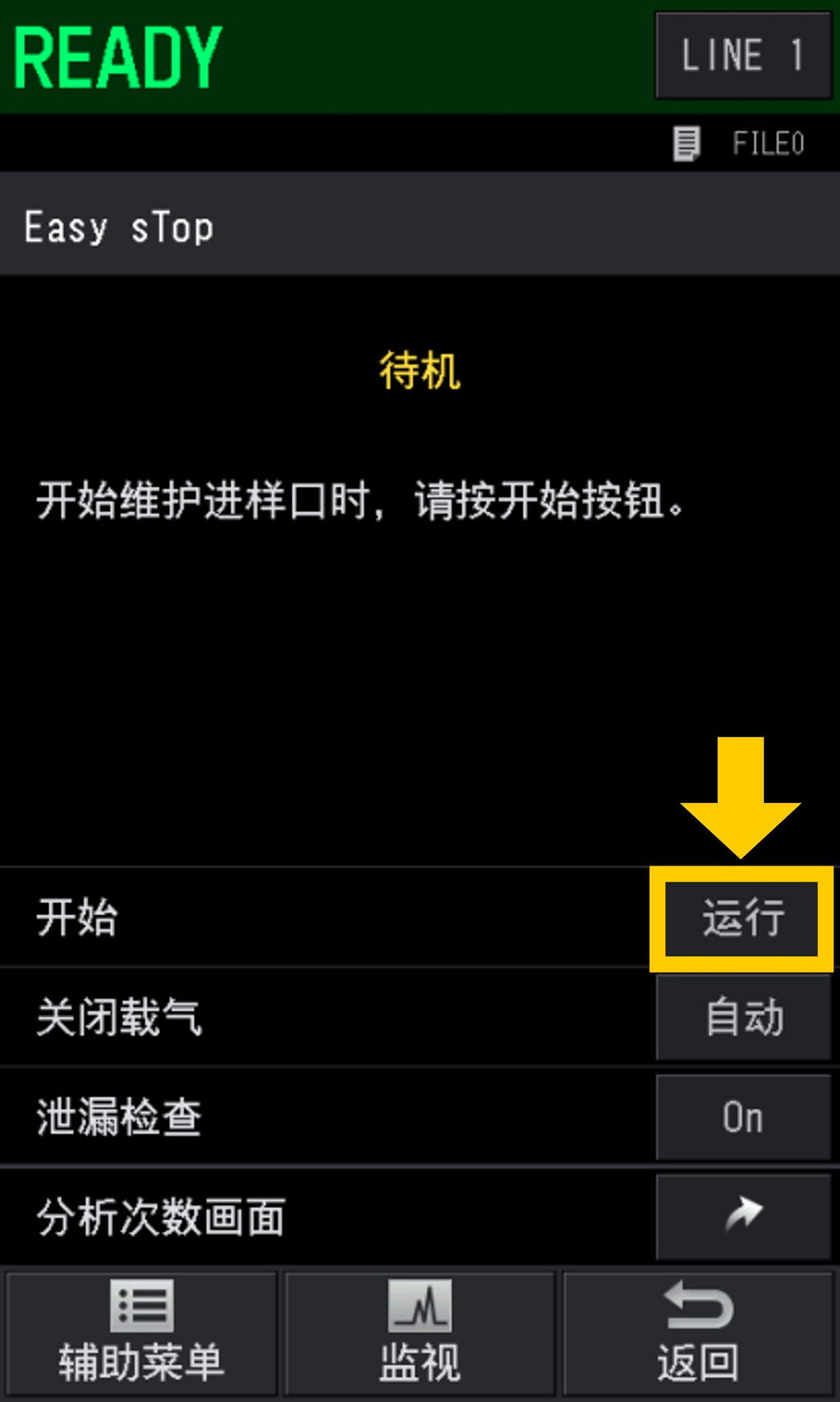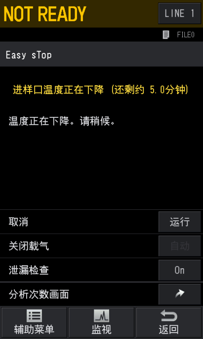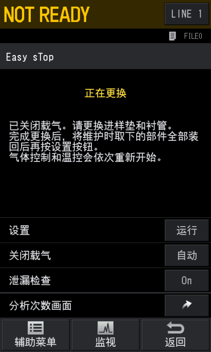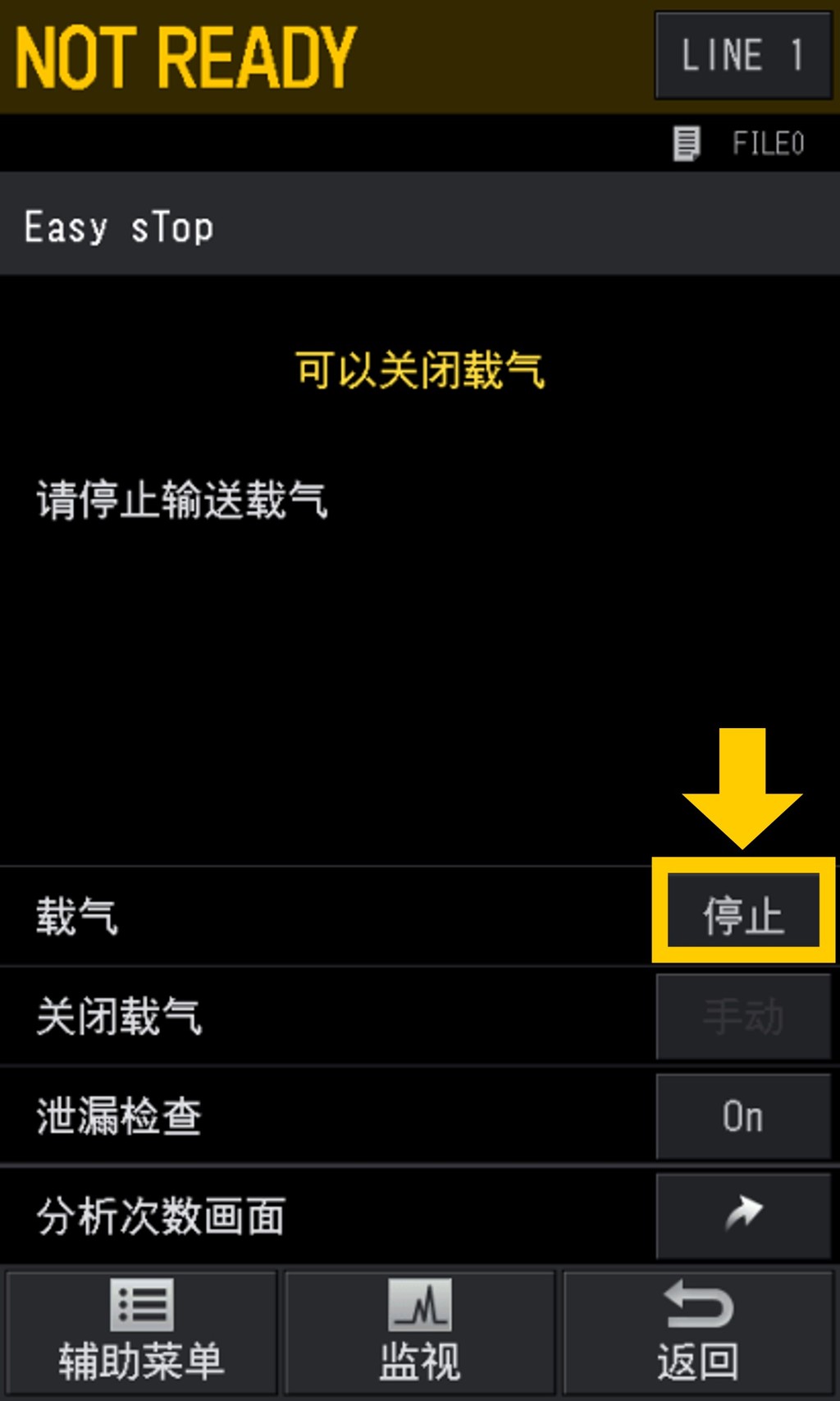 如果窗口中显示[可以关闭载气],请手动[停止]载气。如果[关闭载气]设置为[自动],则不显示该窗口。