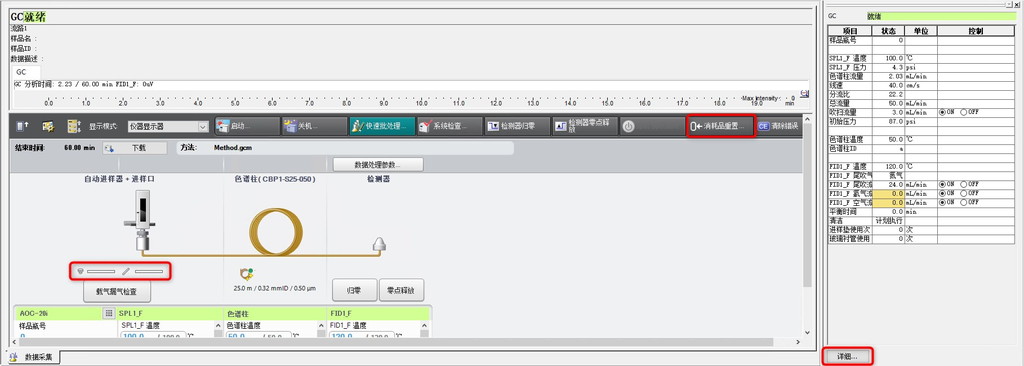 - 单击控制面板的自动进样器+进样口单元的消耗品指示灯。