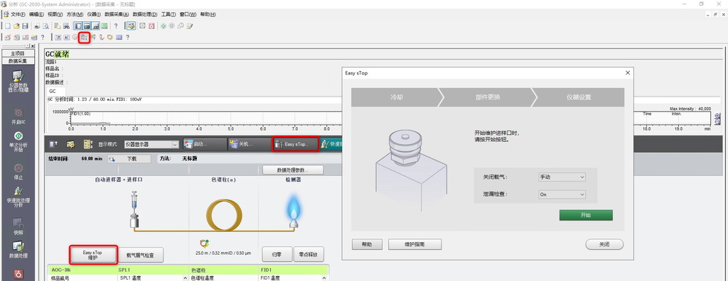 单击[Easy sTop]窗口的[开始]按钮。开始冷却进样口和柱温箱。