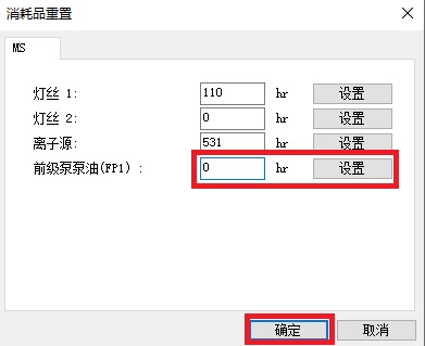 - 在[消耗品重置]窗口的更换后的机械泵油使用时间中输入“0”,单击[设置]按钮。设置后单击[确定]按钮。