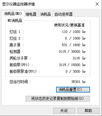 单击[显示仪器监控器详情]窗口的[消耗品(MS)]选项卡,单击[消耗品重置]。