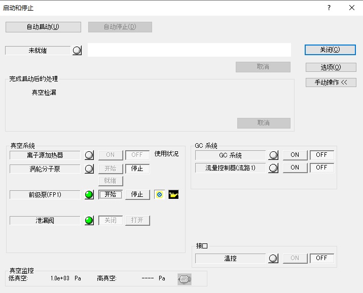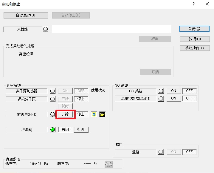 单击[真空系统]组中[前级泵(FP1)]的[启动]按钮。