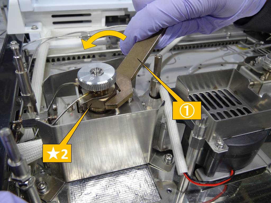 用INJ用扳手(①)拆下玻璃衬管固定螺母(★2)。