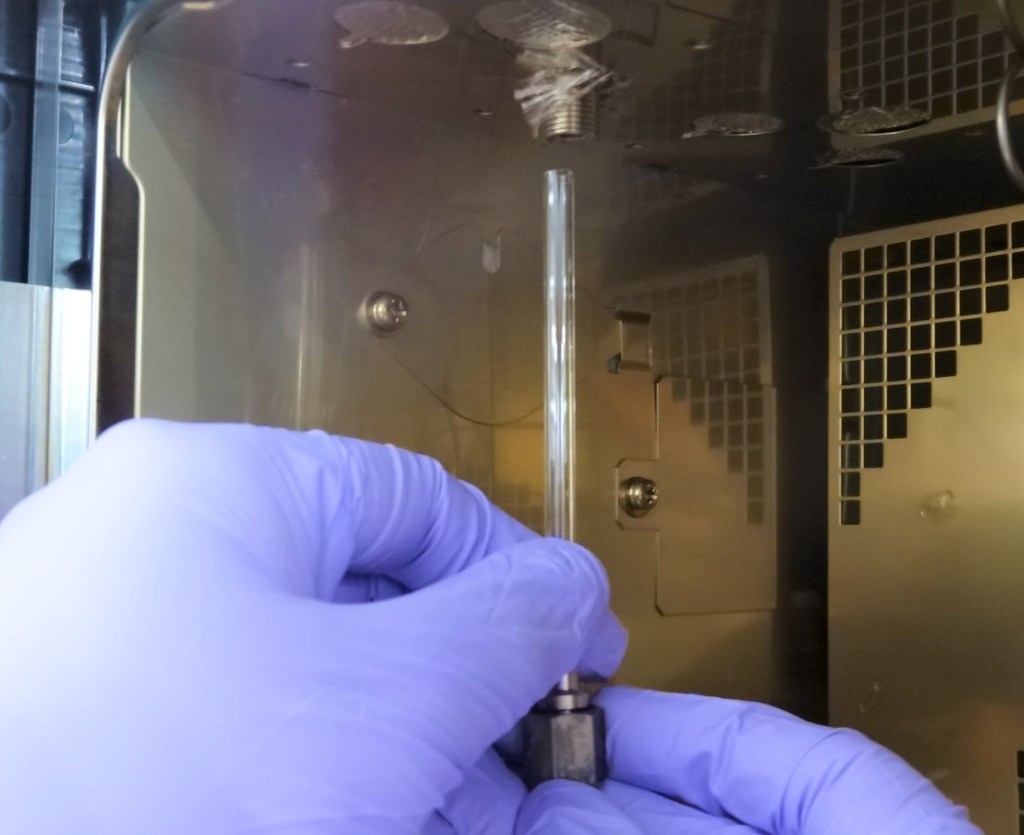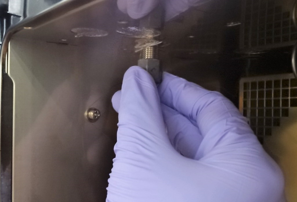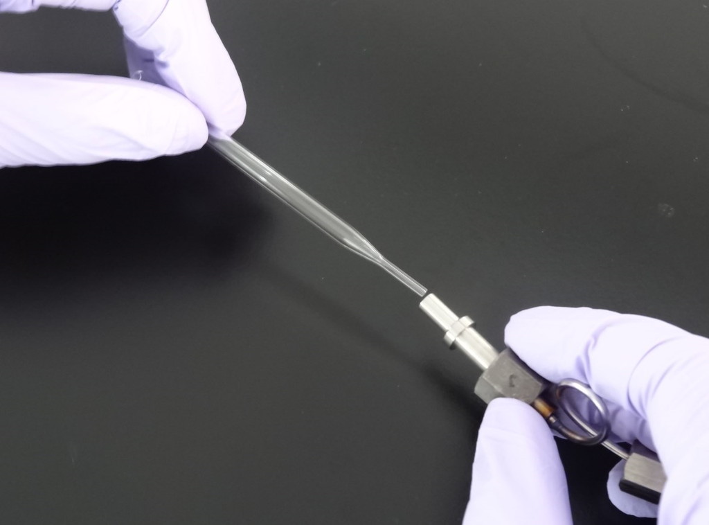 拆卸SUS色谱柱适配器时,玻璃衬管会和SUS色谱柱适配器同时掉落。拆卸时请务必小心,避免玻璃衬管掉落。