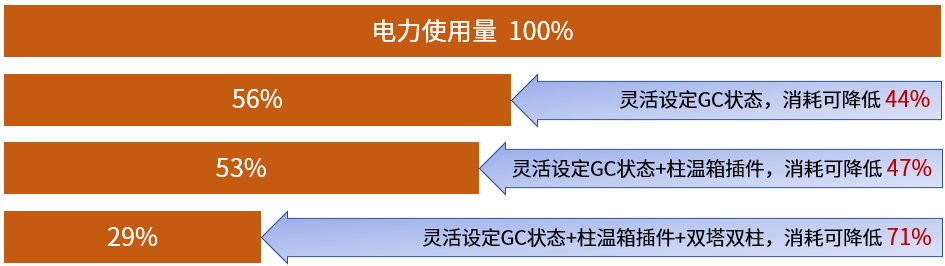通过科学操作气相色谱仪,可以实现节能环保效果。以正常操作下电力消耗量为100%进行模拟,采用多种节能策略的操作后,电力消耗可明显下降。下图所示是节能效果示意图:
