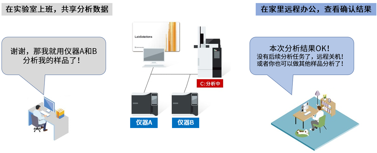 例如,在使用LabSolutions Direct远程访问工具完成批处理分析后,您可以远程查看和确认已完成的数据情况(例如,下图中的设备 A 和 B),如果结果没有问题,并且也没有后续分析任务,则可以远程关闭GC。 或者,您也可以联系在实验室中上班的同事,让他们继续进行其他分析任务,以便减少停机时间,提高仪器利用效率。