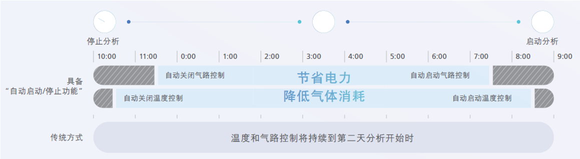 启动和停止GC时,往往需要继续供应载气一段时间以便平衡柱温和稳定系统。当使用自动启动/停止功能时,自动启动功能可在指定时间自动启动气路控制和温度控制;夜间分析结束后,自动停止功能可对GC进行自动降温和关闭载气,从而实现节省电力和气体消耗。通过自动启动/停止功能,提高了分析效率,降低了运行成本。同时,也可以在批处理完成后设置自动停止。