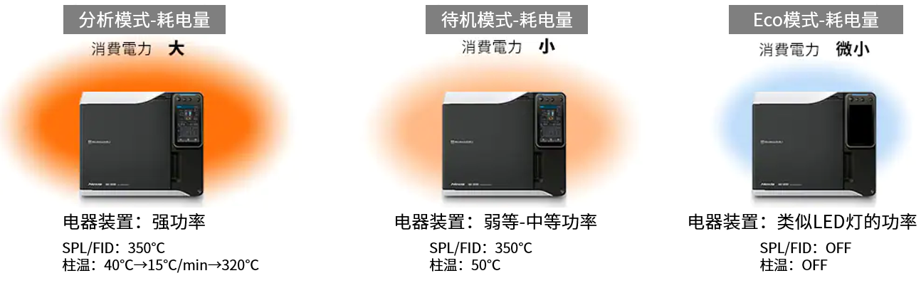 气相色谱仪的进样口、柱温箱和检测器即使在待机状态下,也要始终维持和控制相应的温度,因此此时仍旧需要消耗电力能源。为了降低电力消耗,我们建议没有分析任务的时间,比如晚上和休息日等将气相色谱仪转到Eco模式或者关机状态。下图是不同模式状态下的耗电量对比: