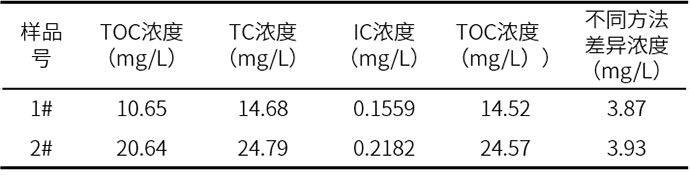 两种方法的差异浓度体现的是可吹除有机碳(POC)的含量,本试验中POC约为3.9 mg/L。以差减法为准,经过两次测量;回收率=(24.57-14.52)/10×100%= 100.5%。符合国标方法要求,回收率在91—109%。