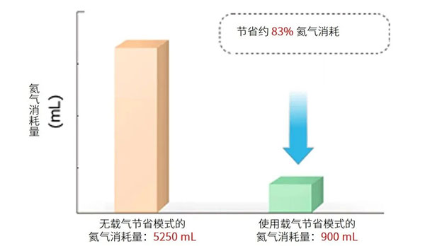运行中省载气:以常见的分流比100:1的30分钟分析实验为例,载气节省模式在完成进样后一分钟,将载气流速从175ml/min降低至25ml/min,整个分析过程均保持低流速运行,直到下个分析开始,有效节省载气消耗。