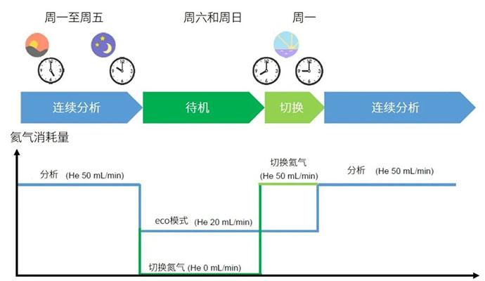 待机时也可节省氦气:编辑批处理表时可勾选分析结束后自动进入eco模式,实现待机时最低载气消耗量。