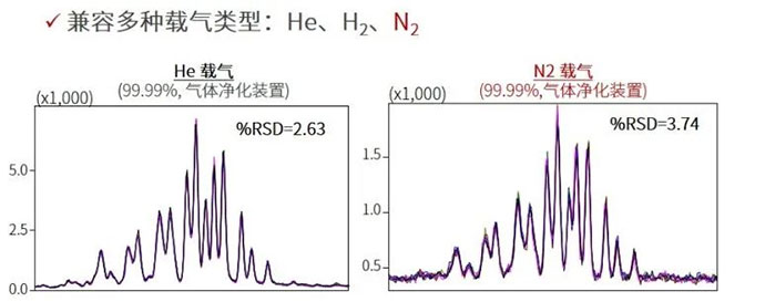全自动的载气切换阀可在批处理表中编辑,氦气、氮气切换自如。由氮气切换回氦气后,稳定15-30分钟即可达到切换前氦气作载气分析时的灵敏度水平。