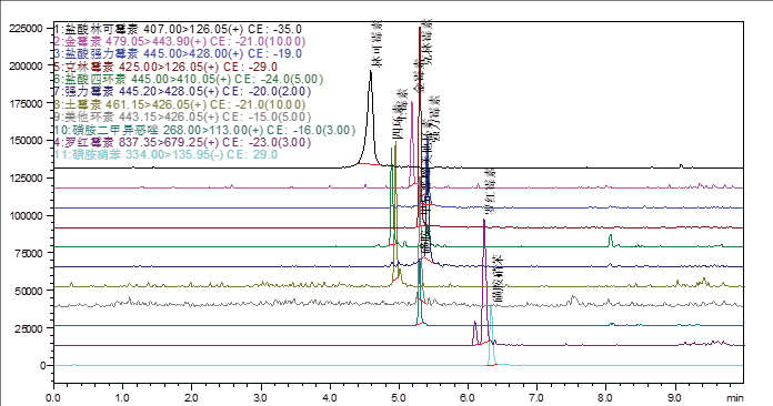应用实例:水中十种抗生素标准样品的MRM检测实例