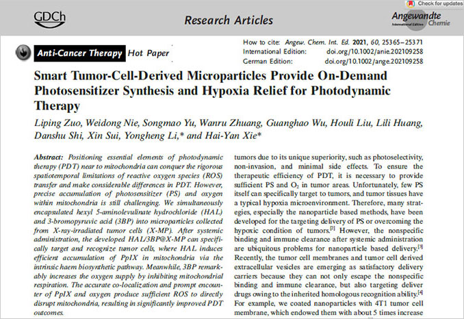 我们与北京理工大学谢海燕团队左立萍博士针对此方法,从光和氧这两个因素进一步探索完善,从而增强了PDT效果,使PDT在临床上发挥更明显的作用,研究成果发表在《Angewandte Chemie》上。