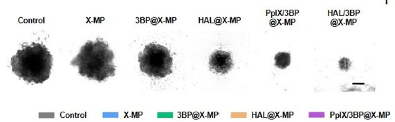 图1. HAL/3BP@X-MP的体外细胞毒性:不同药物处理3天后多细胞肿瘤的球体3D图片