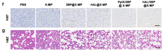 图2 f)中表示不同的PDT对肿瘤细胞增殖的抑制效果(通过Ki67染色表达),结果表明HAL/3BP@X-MP组的PDT对肿瘤细胞增殖的抑制效果最明显;g) 中表示不同的PDT对肿瘤细胞的抗转移作用,结果表明HAL/3BP@X-MP组的抗转移效果最明显。