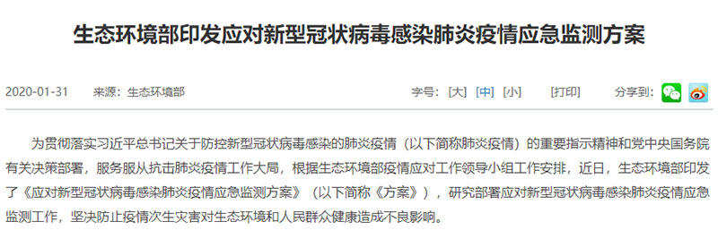 新冠肺炎疫情发生以来,生态环境部第一时间印发《关于做好应对新型冠状病毒感染肺炎疫情生态环境应急监测工作的通知》,要求充分发挥水、空气自动站的监测预警作用,指导各地开展空气、地表水,尤其是饮用水水源地等生态环境质量监测工作,保障防疫期间生态环境质量安全。