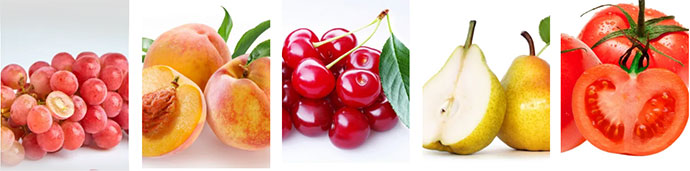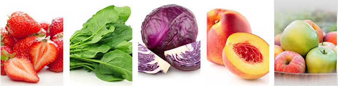 1草莓、2菠菜、3羽衣甘蓝、4油桃、5苹果、6葡萄、7桃子、8樱桃、9梨、10番茄、11芹菜、12土豆
