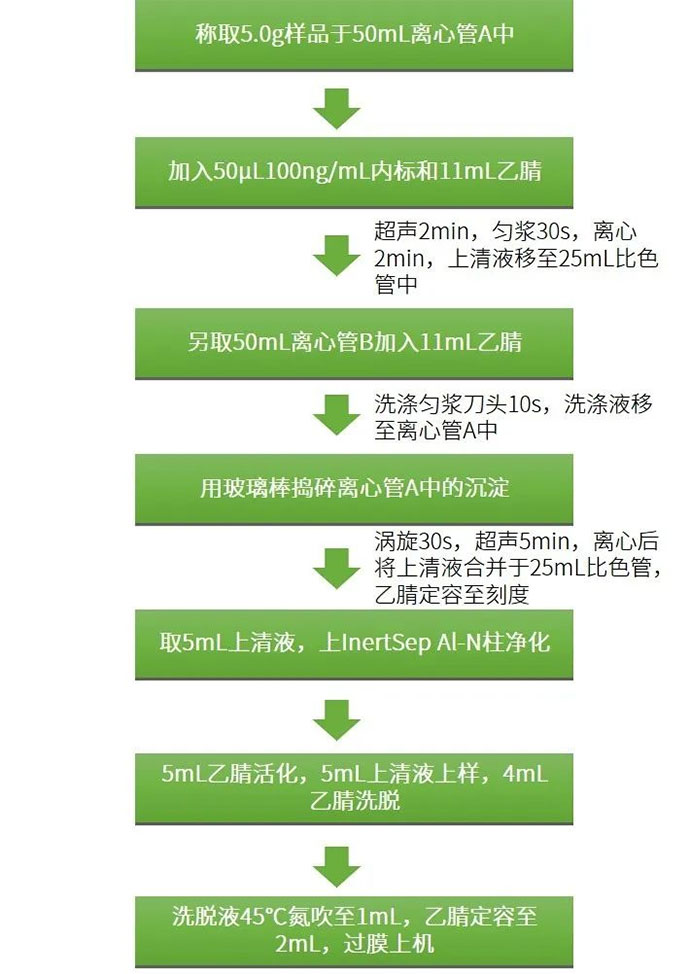开云手机登录入口·(中国)官方网站参考GB19857-2005,采用InertSep Al-N中性氧化铝固相萃取小柱净化,LCMS-8050串接质谱检测分析,内标法定量,检测鳕鱼样品中的孔雀石绿和隐性孔雀石绿,加标浓度为0.5μg/kg,前处理过程如下: