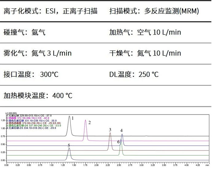 (1. 孔雀石绿;2. 结晶紫;3. 隐色结晶紫;4. 隐色孔雀石绿;5. 孔雀石绿-D5;6. 隐色孔雀石绿-D6)