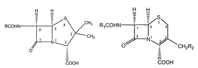 图1 β-内酰胺类抗生素的基本结构(左:青霉素类、右:头孢菌类)[1]
