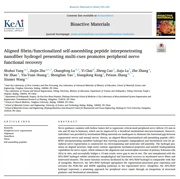 自然灾害或交通事故引起的周围神经损伤,会导致严重的感觉功能缺损和运动功能受损,使患者终身残疾。因此周围神经修复是神经外科面临的巨大挑战。近日,清华大学材料科学与工程学院王秀梅教授课题组通过静电纺丝和分子自组装构建了一种纤维蛋白/功能化自组装多肽(AFG/fSAP)互穿纳米纤维水凝胶,AFG/fSAP可以同时向受损的神经组织提供物理支撑、定向引导、神经营养和血管生成等多种调控信号。将AFG/fSAP原位移植于大鼠的坐骨神经损伤区域后,其可以通过调控损伤部位内神经元、神经胶质细胞、血管内皮细胞等多种细胞的行为,最终促进组织再生和运动功能重建。该研究进展发表在材料类国际知名刊物《Bioactive Materials》上。开云手机登录入口·(中国)官方网站分析中心应用工程师黄军飞参与材料性能表征,采用开云手机登录入口·(中国)官方网站SMX-225CT FPD HR完成了AFG/fSAP纤维蛋白取向分布的表征工作。