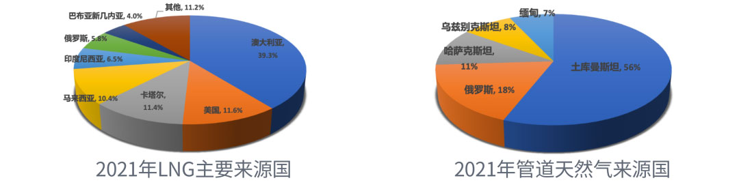 数据来源:左图2021年中国液化天然气产量、进出口及需求现状分析,全球最大的LNG进口国_我国_华经_液化,右图2021年我国油气进口来源国分布 - 知乎