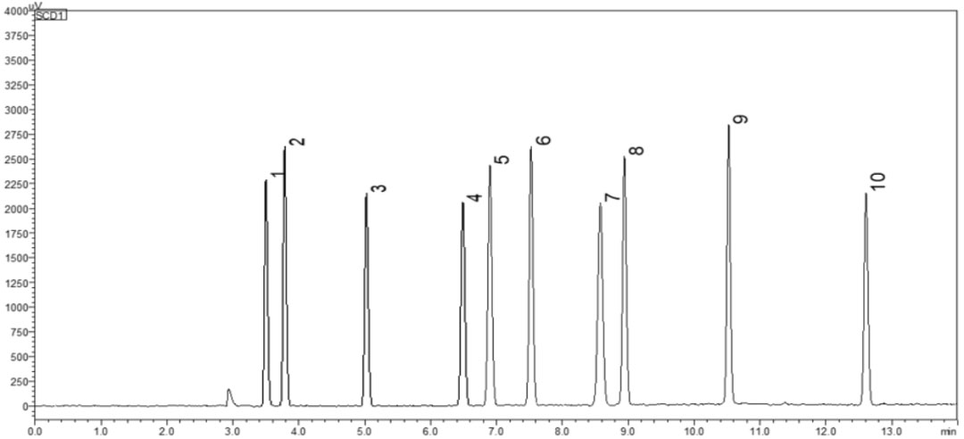 图2.浓度1.0mg/m3天然气中硫化物标气谱图(1硫化氢、2氧硫化碳、3甲硫醇、4乙硫醇、5甲硫醚、6二硫化碳、7叔丁硫醇、8甲基乙基硫醚、9乙硫醚、10四氢噻吩)