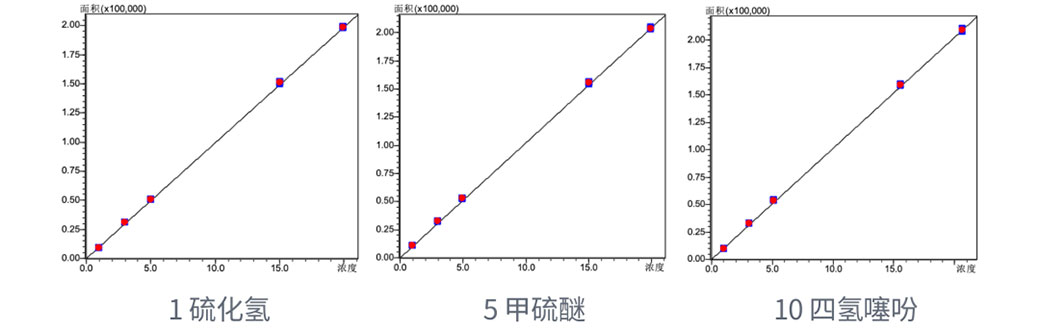 5瓶混和标气浓度以硫计分别为:1.0mg/m3 、3.0mg/m3、5.0mg/m3、15.0mg/m3、20.0mg/m3。硫化物混合标气重复进样4次,各组分面积重复性均优于1.0%,相关系数R值除甲硫醇和乙硫醇为0.9998外其余8种硫化物都大于0.9999。选择了其中3种硫化物的标准曲线展示见图3。各硫化物的检出限见表1。