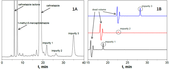 图1 注射用头孢美唑钠热解样品的一维(1A)和3种目标杂质(杂质1-3)的二维(1B)色谱图