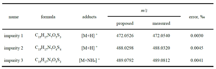 表1 头孢美唑钠中杂质的分子式、加和离子和误差