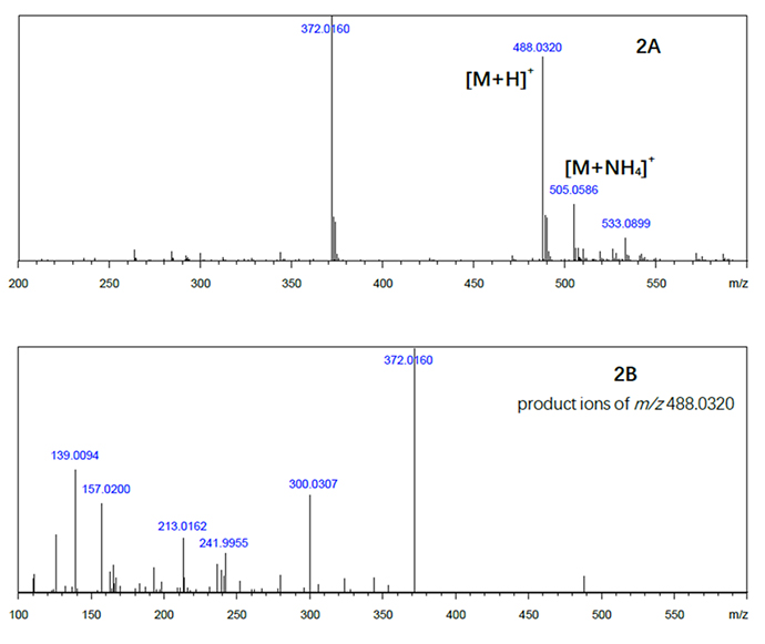 图2 杂质2在正模式下的扫描离子(2A)和m/z 488.0320的产物离子质谱图(2B)