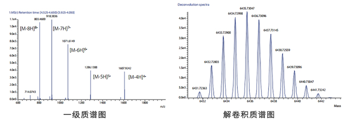 采用QTOF LCMS-9030采集一个长度为20 mer的寡核苷酸药物的高分辨质谱图,使用Insight Explore CSD进行解卷积处理,得到实测单同位素分子量为6431.7236,质量数偏差为0.05 ppm。